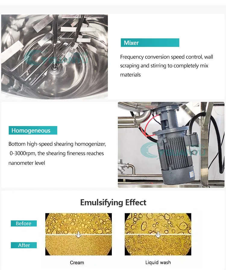 Model | Working Capacity (L) | Mixing Power (KW) | Mixing Speed (rpm) | Homogenizing Power(KW) | Homogenizing Speed(rpm) | Heating Method |